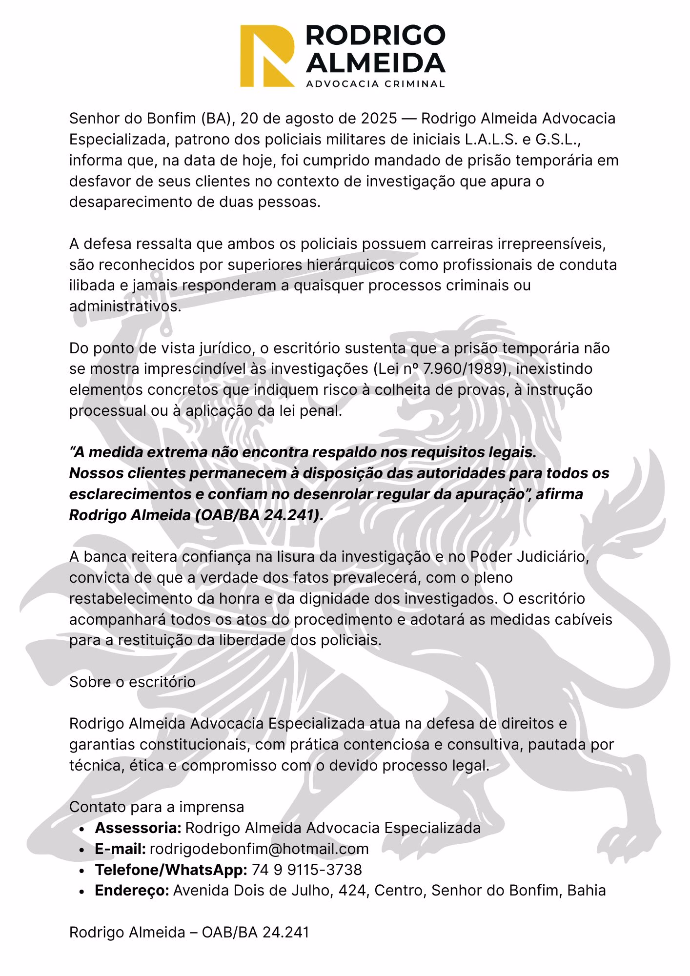 Em nota, o escritório Rodrigo Almeida Advocacia Especializada — patrono dos policiais de iniciais L.A.L.S. e G.S.L. — afirmou que as prisões são temporárias e que os clientes têm carreira “irrepreensível”, sem histórico de processos. A banca sustenta que a medida extrema “não se mostra imprescindível às investigações”, e diz confiar no regular andamento do caso e no Poder Judiciário.